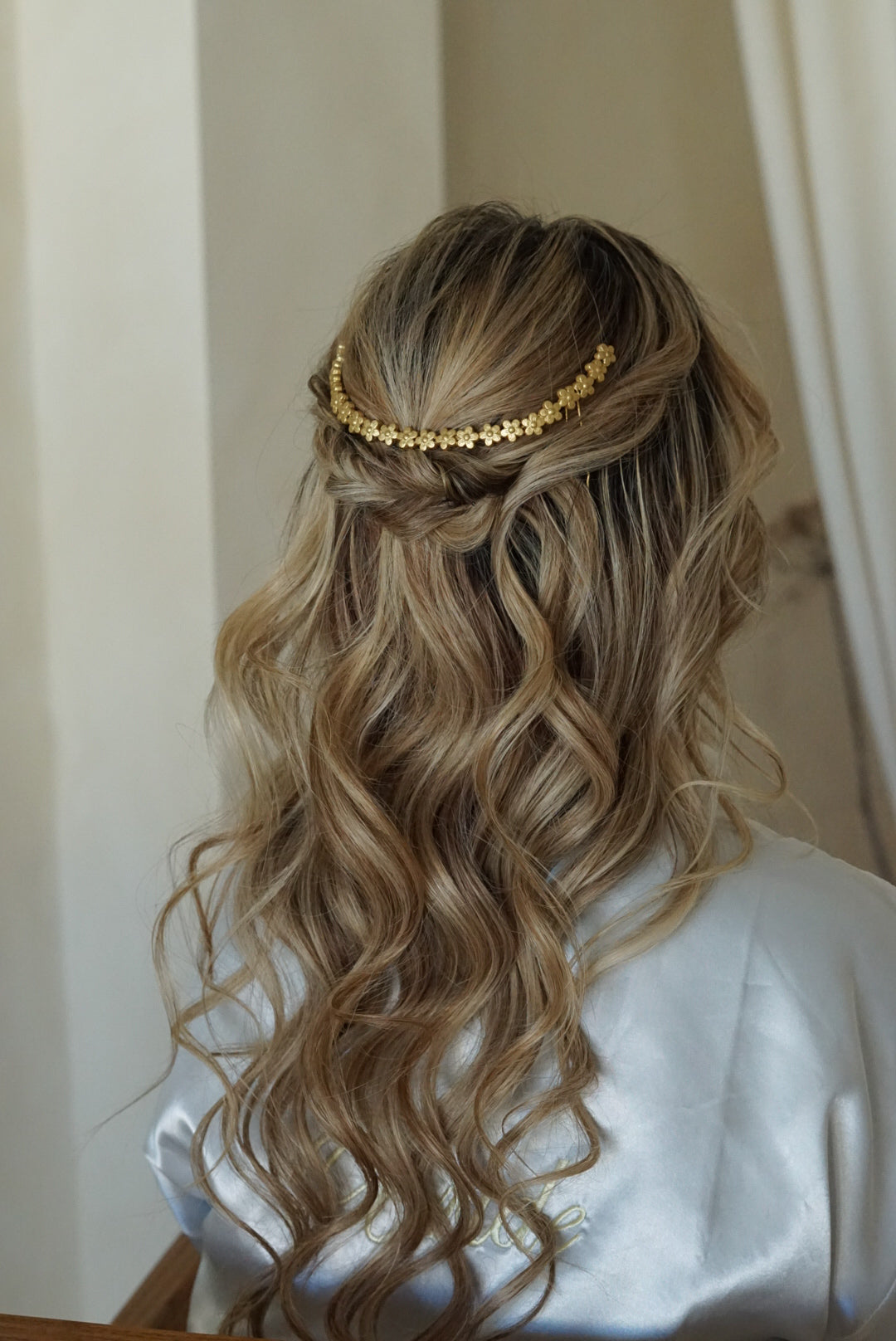 El Tocado Amorey es un accesorio para el cabello con encanto, ideal para novias que buscan un toque romántico y delicado. Elaborado a mano con flores doradas que recorren toda la pieza, ofrece un brillo sutil y una elegancia atemporal. Este tocado es perfecto para realzar peinados sofisticados y crear recuerdos inolvidables en días especiales.